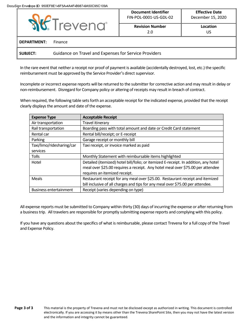Document Identifier FIN-POL-0001-US-GDL-02 Effective Date December 15, 2020 Revision Number 2.0 Location US DEPARTMENT: Finance SUBJECT: Guidance on Travel and Expenses for Service Providers Page 1 of 3 This material is the property of Trevena and must not be disclosed except as authorized in writing. This document is controlled electronically. If you are accessing it by means other than the Trevena SharePoint Site, then you may not have the latest version and the information and integrity cannot be guaranteed. Travel and Expense Guidelines for Consultants, Contractors, Vendors, Reasonable out-of-pocket applicable expenses incurred in accordance with Travel and Expense Policy will be reimbursed at cost to Service Providers provided that such expenses are deemed appropriate business expenses and the expenses are properly reported and accompanied by appropriate supporting documentation. Out-of-pocket expenses are those incremental expenses the Service Providers incur in the delivery of the services provided. For example, ongoing home office expenses, would not be considered out-of-pocket and are not reimbursable. Any Service Provider requesting reimbursement for any such reimbursable expense is required to complete a standard expense reimbursement form and submit the completed form, along with all supporting documentation, to the Company's designated supervisor. Appropriate supporting documentation includes the original receipt, invoice, or other similar evidence of payment. Credit card statements are not generally considered acceptable supporting documentation and should only be used in the absence of a receipt on an exception basis. All Service Providers are expected to use good business judgement when incurring reimbursable expenses. below: a) Airline Travel actual costs of the airfare shall be charged. Coach class is required to be booked for all flights within the United States. Any exceptions must be approved in advance by Trevena senior management or their designee. International flights must also gain prior approval from the company designee. Trevena will not pay for any first-class travel or for travel or expenses for individuals other than the Service Provider (such as spouses, partners, or family members). No hourly labor rate shall apply during travel times Trevena specifically allows such compensation. Service Providers shall schedule airline travel fourteen (14) days in advance, unless otherwise agreed to in writing by Trevena. The cost of reasonable ground transportation, parking, etc. for business travel shall be charged at actual cost incurred, including any reasonable gratuities. b) Ground Transportation in the event Service Providers utilizes his/her own vehicle to travel to the venue of a scheduled event, the current IRS mileage standard per mile shall be charged plus any tolls and/or parking costs incurred. If the Parties agree to the use of a rental car, actual costs plus fuel and tolls will be reimbursed. Single travelers renting a car must - vehicle appropriate to the group size is reimbursable. Rail transportation may be a more convenient means of travel than airline or automobile. Fares are reimbursed at senior management or their designee. c) Taxi/Car Services Taxi or car services, such as Uber or Lyft used in connection with travel for Services will be reimbursed in full. ''Black Car'' or ''limousine'' services (including such services as Uber Black and Lyft Lux) are not reimbursable unless approved in advance by the Company's CEO or her/his designees. d) Lodging standard, single room rates shall be charges using reasonably priced facilities. e) Meals Reasonable costs of business meals in connection with the provision of Services will be reimbursed in full. In |